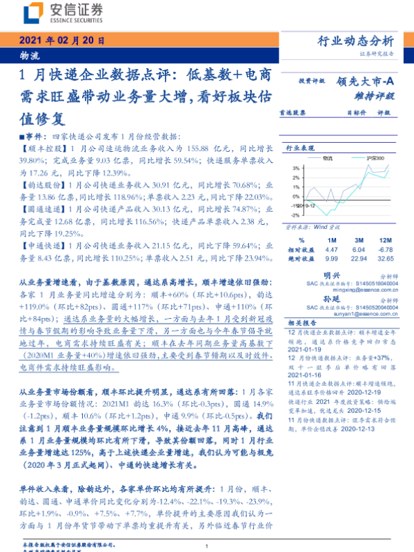 【安信证券】【20210220】1月快递企业数据点评:低基数+电商需求旺盛带动业务量大增,看好板块估值修复-4页 行业研究