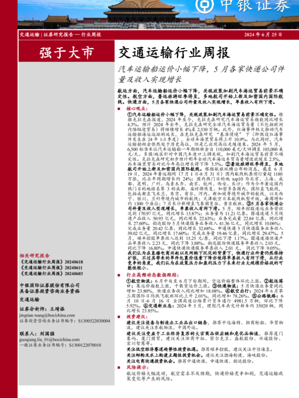 【中银证券】【20240625】交通运输行业周报:汽车运输船运价小幅下降,5月各家快递公司件量及收入实现增长-27页 行业研究