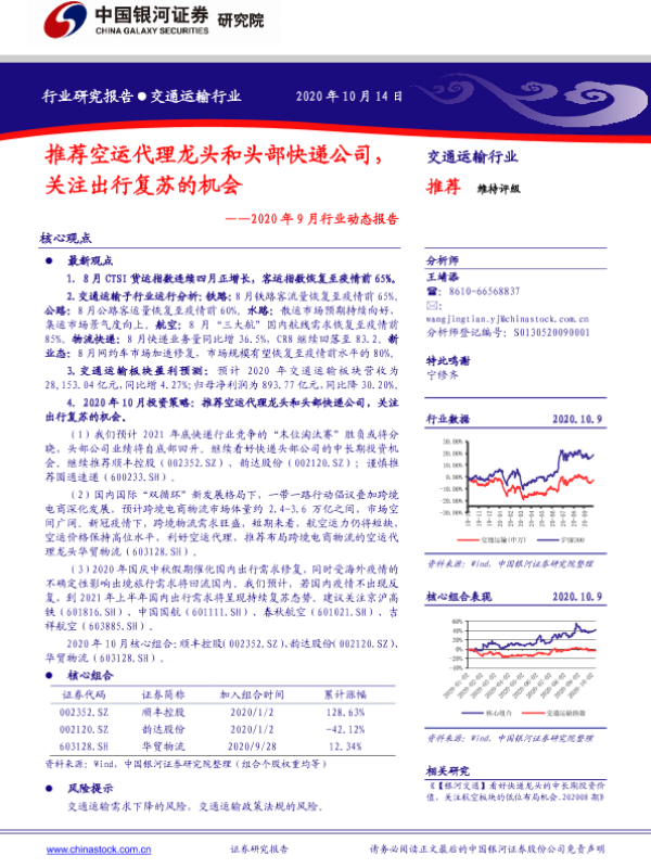 【银河证券】【20201014】交通运输行业2020年9月行业动态报告:推荐空运代理龙头和头部快递公司,关注出行复苏的机会-44页 行业研究