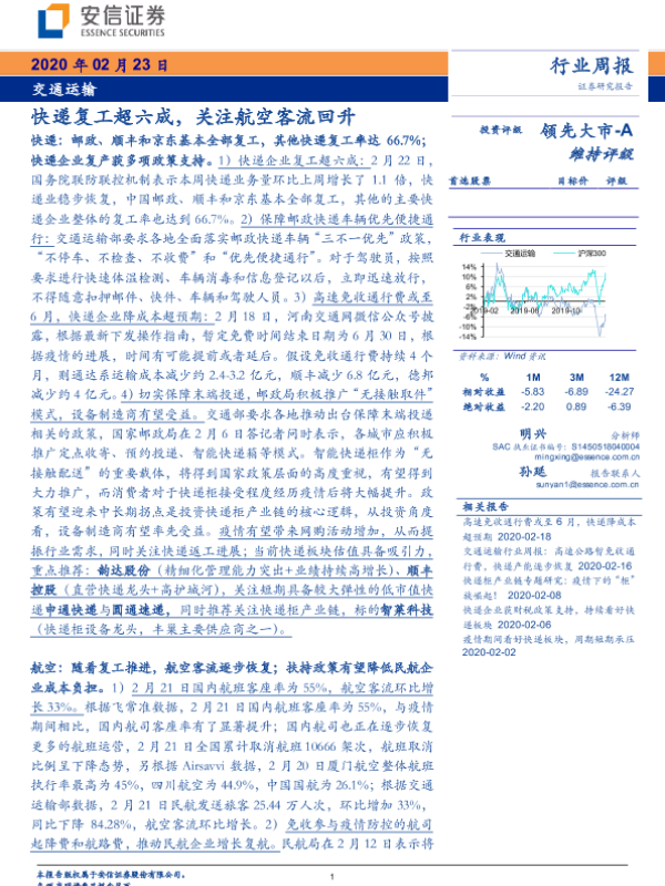 【安信证券】【20200223】交通运输行业周报:快递复工超六成,关注航空客流回升-19页 行业研究