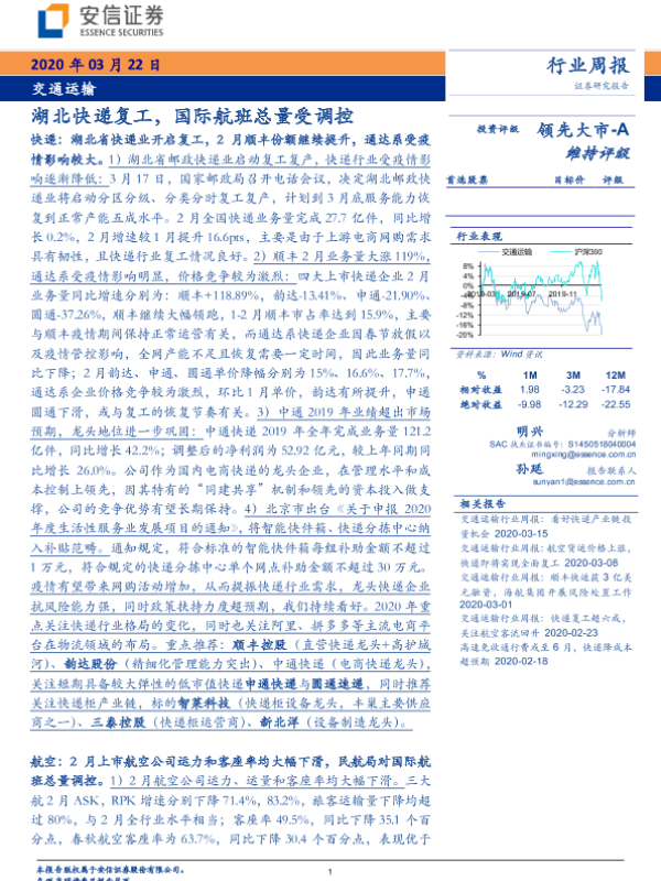【安信证券】【20200322】交通运输行业周报:湖北快递复工,国际航班总量受调控-20页 行业研究