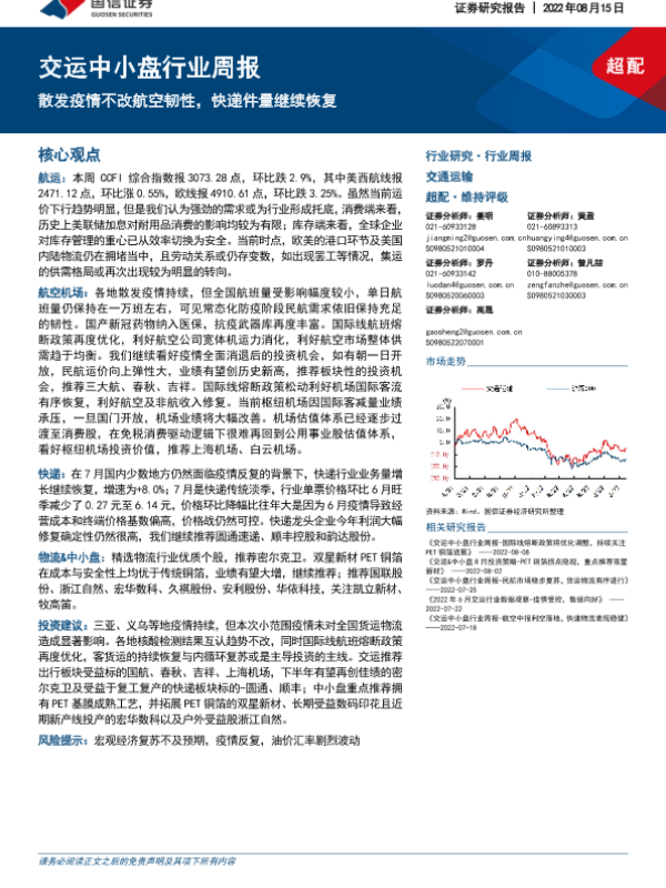 【国信证券】【20220815】交运中小盘行业周报:散发疫情不改航空韧性,快递件量继续恢复-27页 行业研究