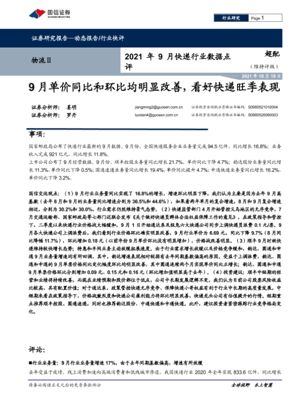【国信证券】【20211019】2021年9月快递行业数据点评-7页 行业研究