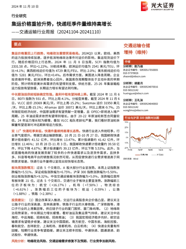 【光大证券】【20241110】交通运输行业周报:集运价格重拾升势,快递旺季件量维持高增长-15页 行业研究