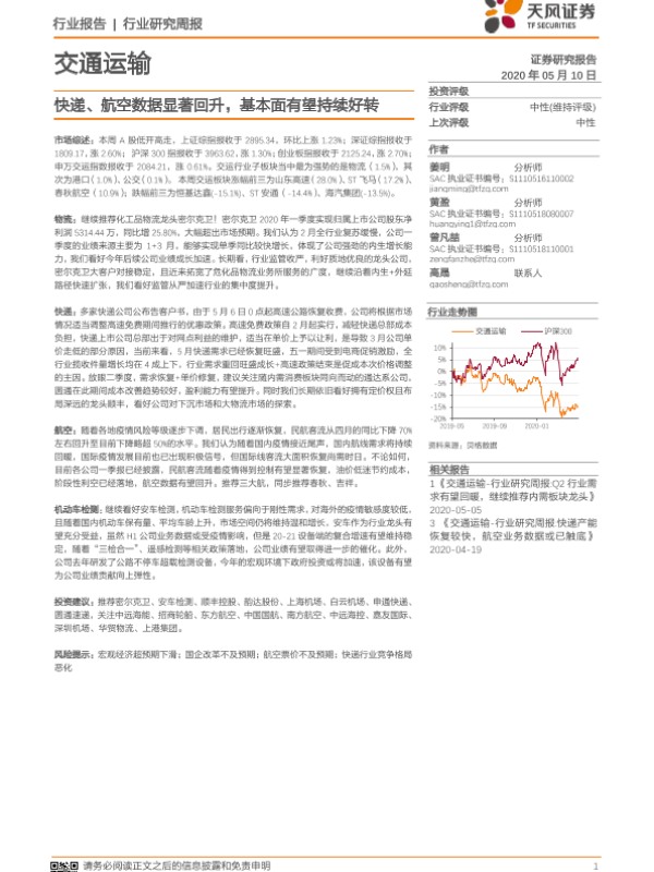 【天风证券】【20200510】交通运输行业研究周报:快递、航空数据显著回升,基本面有望持续好转-13页 行业研究