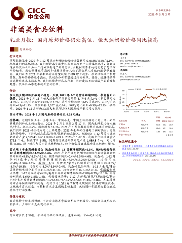 【中金公司】【20210302】非酒类食品饮料:乳业月报:国内原奶价格仍处高位,恒天然奶粉价格同比提高-18页 行业研究