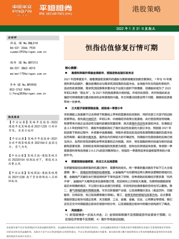 【平安证券(香港)】【20220121】港股策略:恒指估值修复行情可期-18页 行业研究