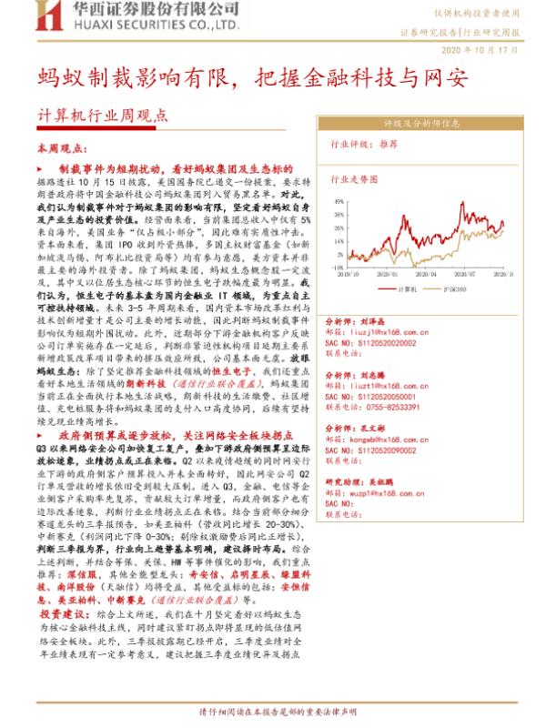 【华西证券】【20201017】20201017-华西证券-计算机行业周观点:蚂蚁制裁影响有限,把握金融科技与网安-18页 行业研究