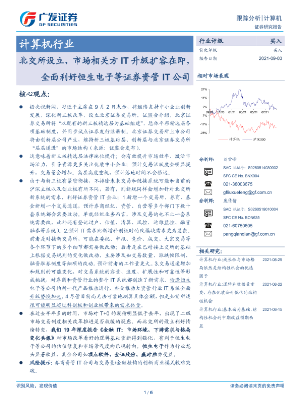 【广发证券】【20210903】计算机行业:北交所设立,市场相关方IT升级扩容在即,全面利好恒生电子等证券资管IT公司-6页 行业研究