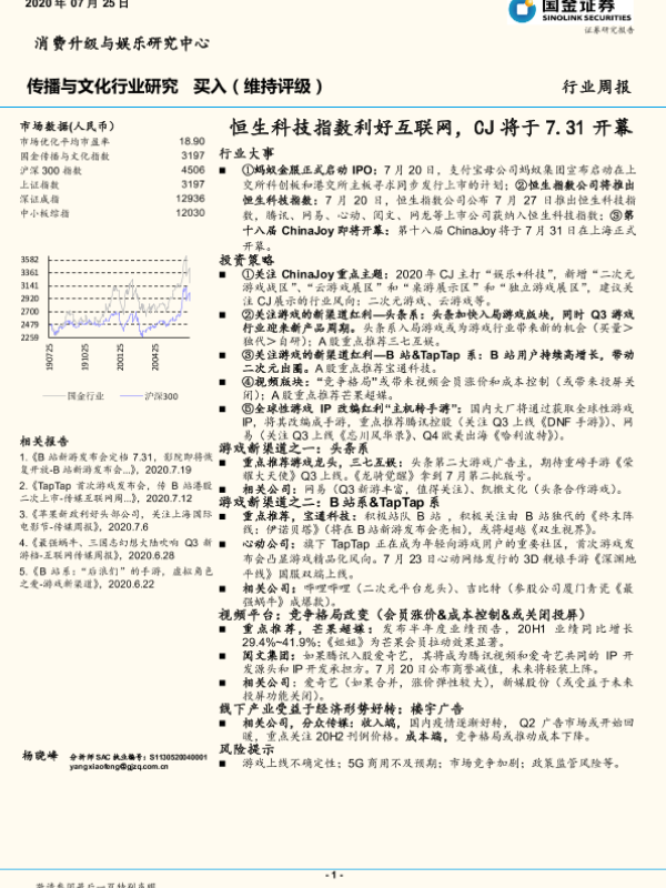 【国金证券】【20200725】传播与文化行业研究:恒生科技指数利好互联网,CJ将于7.31开幕-3页 行业研究