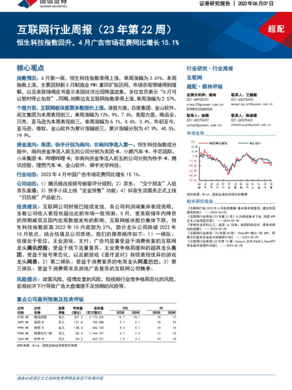 【国信证券】【20230607】20230607-国信证券-互联网行业周报(23年第22周):恒生科技指数回升,4月广告市场花费同比增长15.1%-12页 行业研究