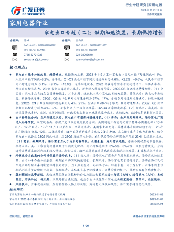 【广发证券】【20231112】家用电器行业:家电出口专题(二):短期加速恢复,长期保持增长-26页 行业研究