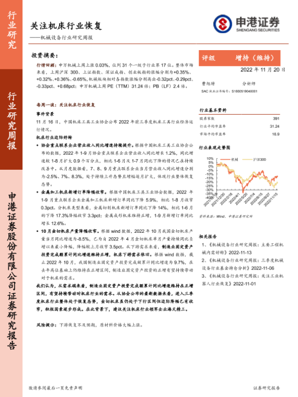 【申港证券】【20221120】20221120-申港证券-机械设备行业研究周报:关注机床行业恢复-10页 行业研究
