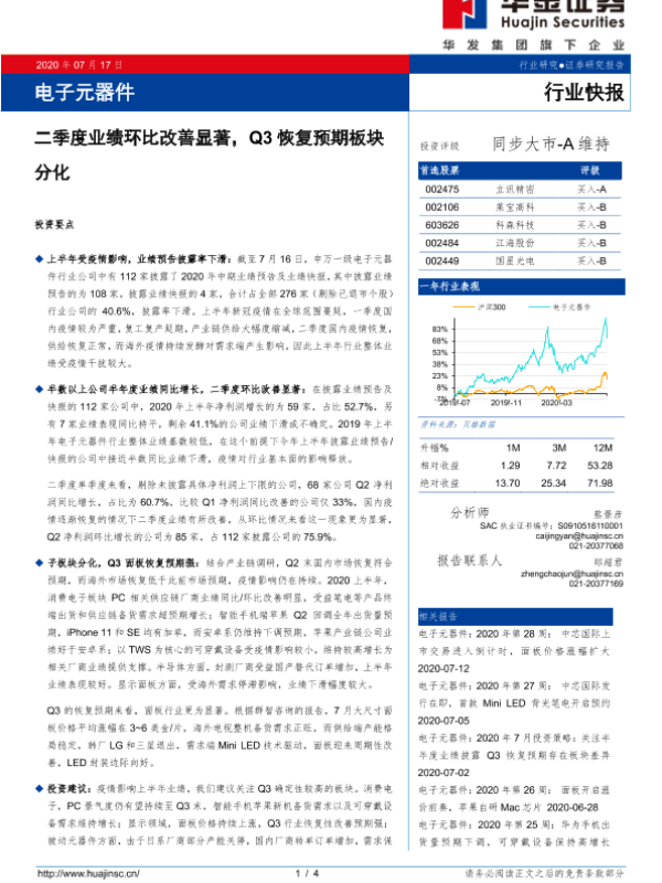【华金证券】【20200717】电子元器件:二季度业绩环比改善显著,Q3恢复预期板块分化-4页 行业研究