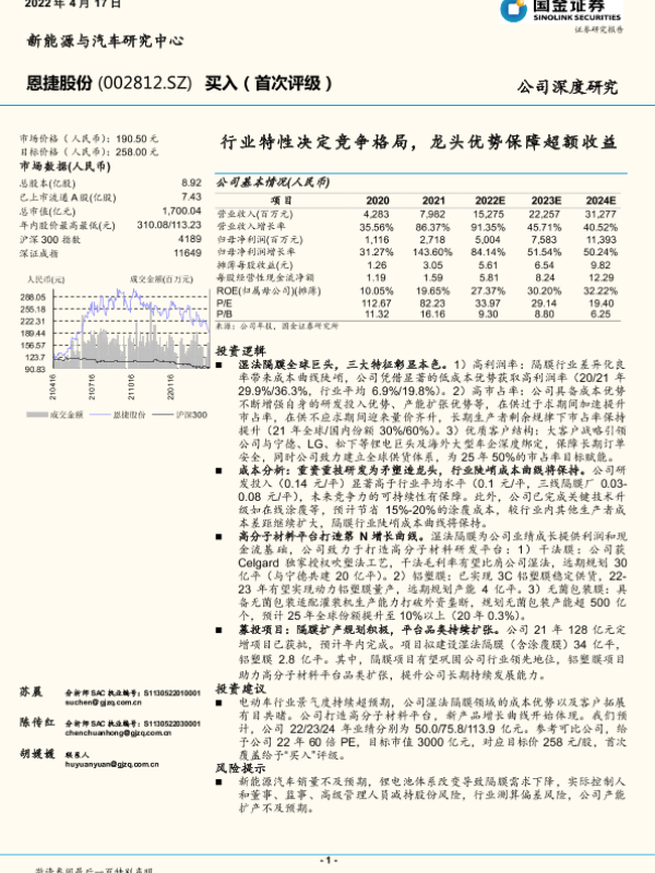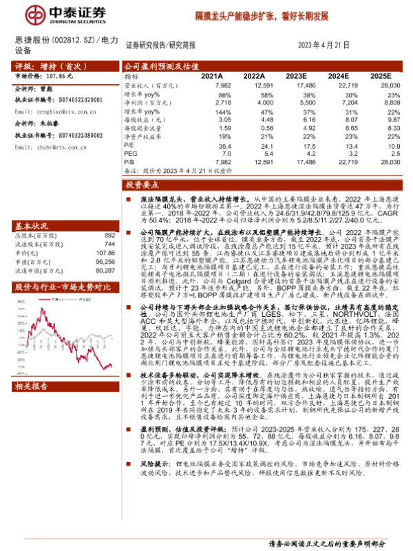 【中泰证券】【20230421】中泰证券-恩捷股份-隔膜龙头产能稳步扩张,看好长期发展-23页 行业研究