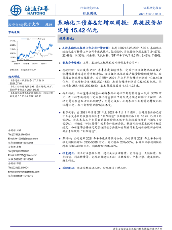 【海通证券】【20210705】基础化工债券&定增双周报:恩捷股份拟定增15.42亿元-14页 行业研究