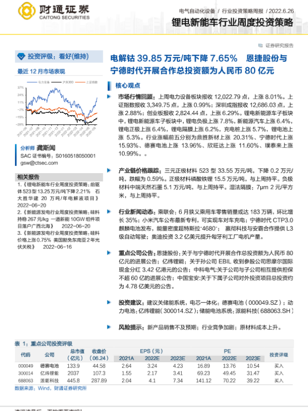 【财通证券】【20220626】锂电新能车行业周度投资策略:电解钴39.85万元 吨下降7.65%,恩捷股份与宁德时代开展合作总投资额为人民币80亿元-19页 行业研究