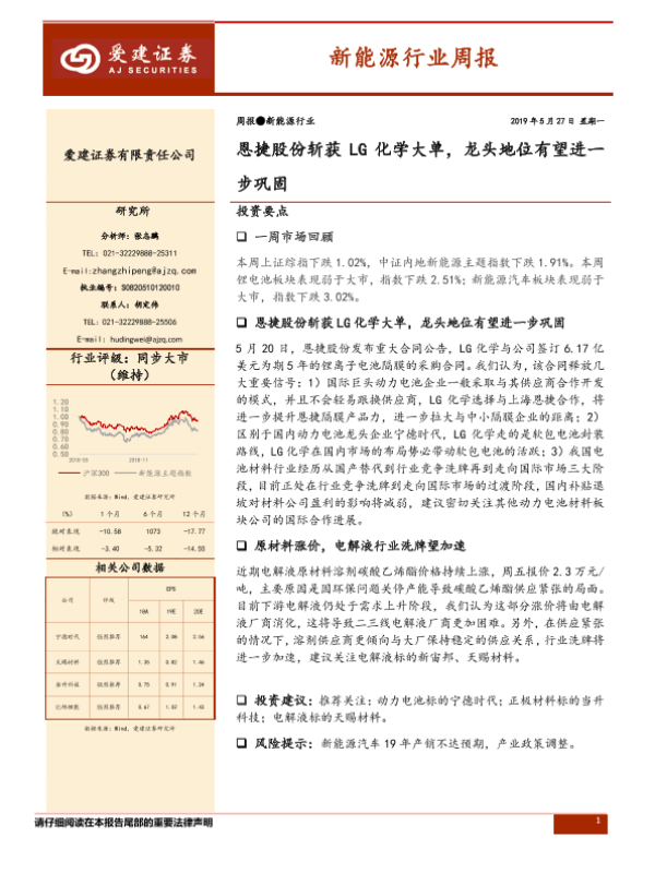 【爱建证券】【20190527】新能源行业周报:恩捷股份斩获LG化学大单,龙头地位有望进一步巩固-14页 行业研究