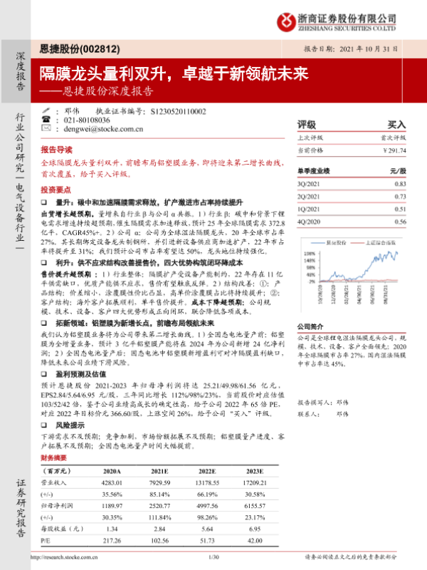【浙商证券】【20211031】恩捷股份深度报告:隔膜龙头量利双升,卓越于新领航未来-30页 行业研究