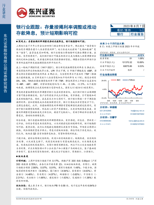 【东兴证券】【20230807】银行业跟踪:存量按揭利率调整或推动存款降息,预计短期影响可控-11页 行业研究