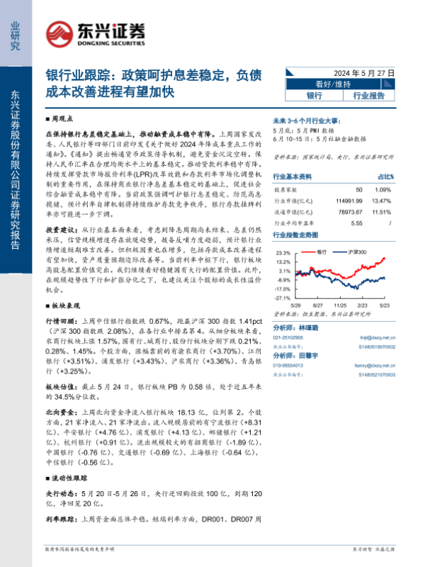 【东兴证券】【20240527】银行业跟踪:政策呵护息差稳定,负债成本改善进程有望加快-10页 行业研究