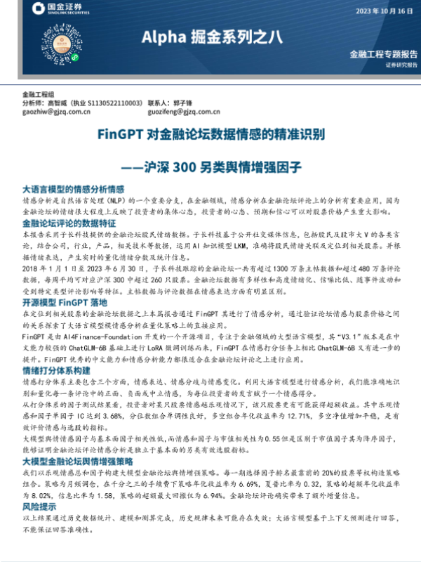 【国金证券】【20231016】Alpha掘金系列之八:沪深300另类舆情增强因子,FinGPT对金融论坛数据情感的精准识别-22页 行业研究
