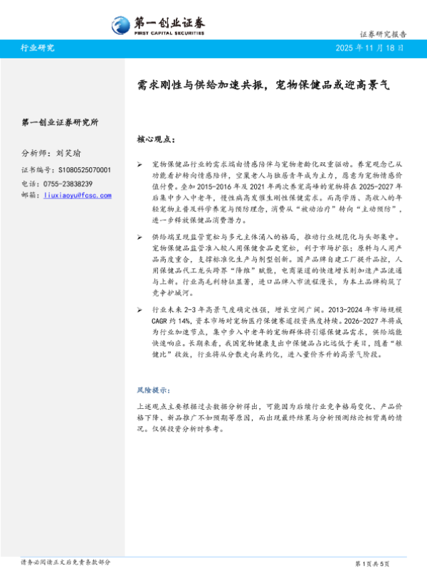 【第一创业证券】【202511】需求刚性与供给加速共振,宠物保健品或迎高景气-5页 证券期货研究报告