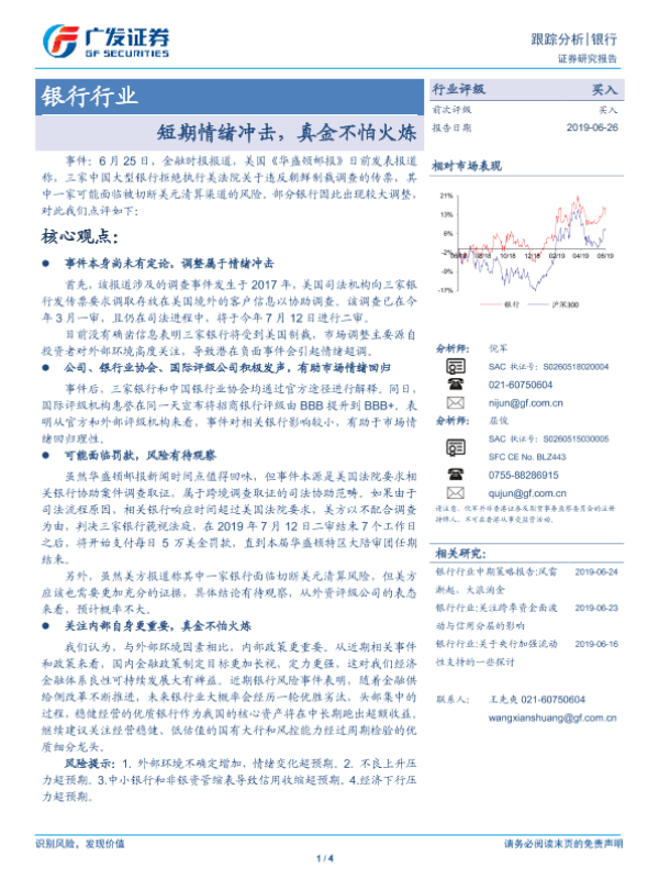 【广发证券】【20190626】银行行业:短期情绪冲击,真金不怕火炼-4页 行业研究