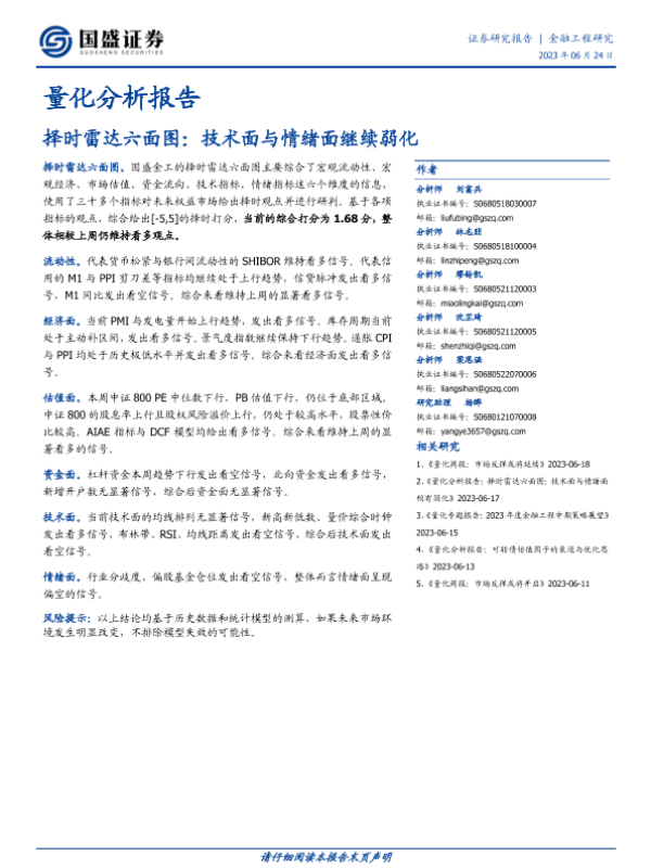 【国盛证券】【20230624】量化分析报告:择时雷达六面图,技术面与情绪面继续弱化-23页 行业研究