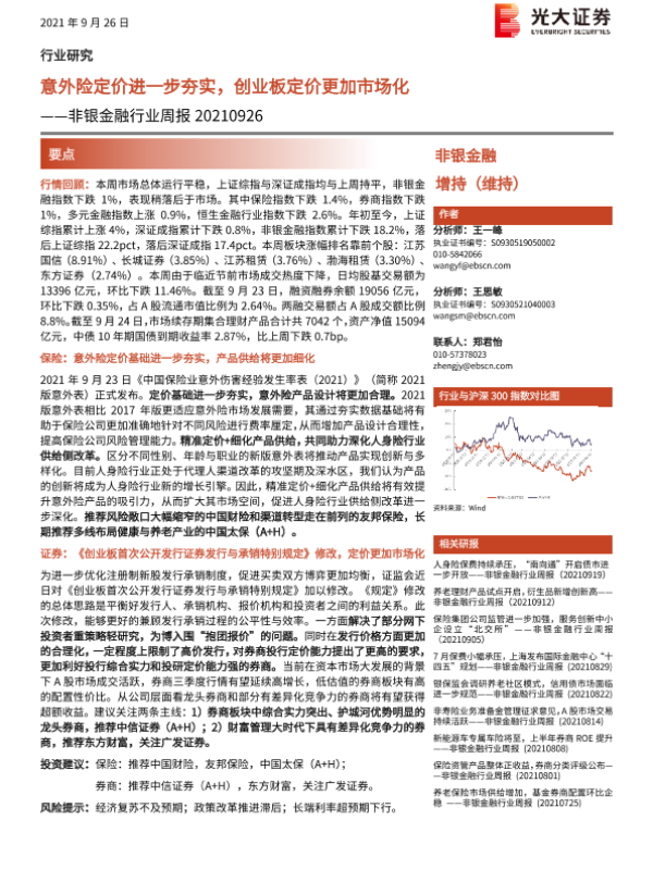 【光大证券】【20210926】非银金融行业周报:意外险定价进一步夯实,创业板定价更加市场化-10页 行业研究