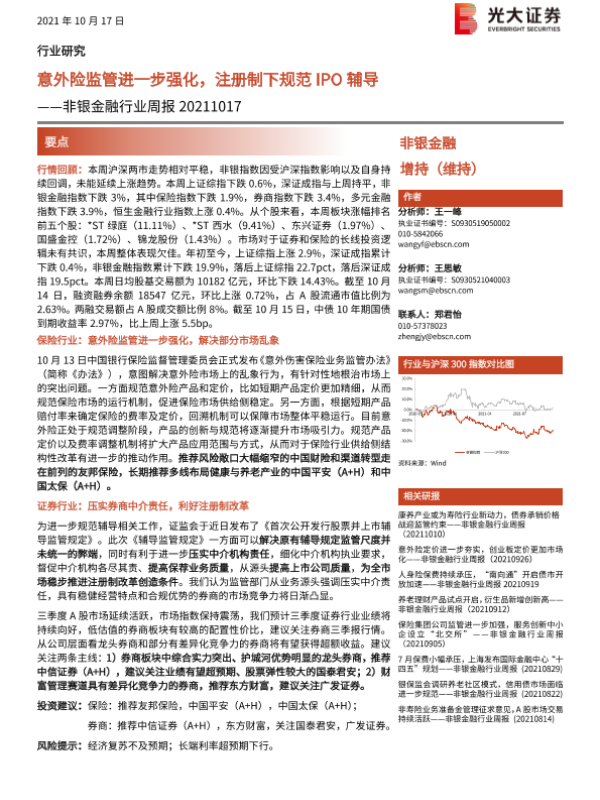 【光大证券】【20211017】非银金融行业周报:意外险监管进一步强化,注册制下规范IPO辅导-10页 行业研究