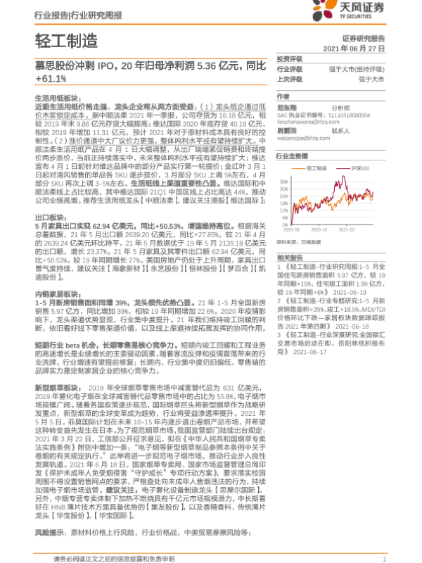【天风证券】【20210627】轻工制造行业研究周报:慕思股份冲刺IPO,20年归母净利润5.36亿元,同比+61.1%-26页 行业研究