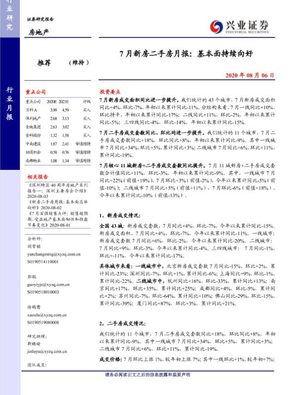 【兴业证券】【20200806】7月新房二手房月报:基本面持续向好-18页 行业研究