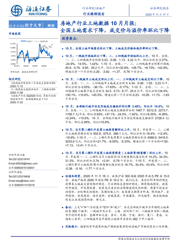 【海通证券】【20201117】房地产行业土地数据10月月报:全国土地需求下降,成交价与溢价率环比下降-9页 行业研究