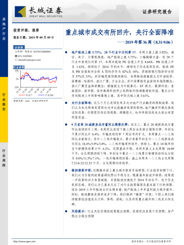 【长城证券】【20190909】房地产2019年第36周:重点城市成交有所回升,央行全面降准-16页 行业研究