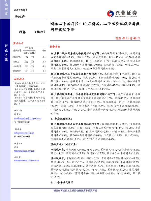 【兴业证券】【20211109】新房二手房月报:10月新房、二手房整体成交套数同环比均下降-9页 行业研究
