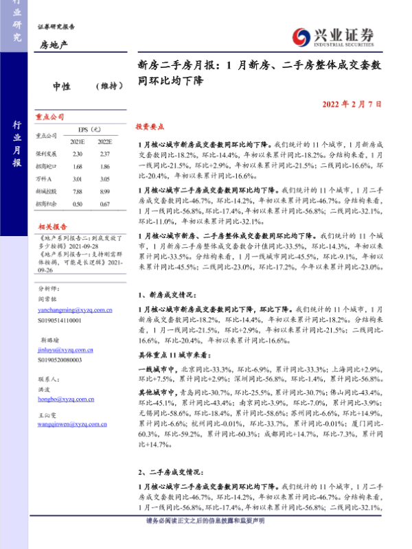 【兴业证券】【20220207】1月新房、二手房整体成交套数同环比均下降-9页 行业研究