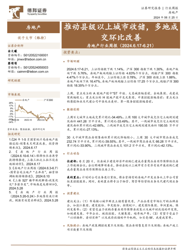 【德邦证券】【20240625】推动县级以上城市收储,多地成交环比改善-11页 行业研究