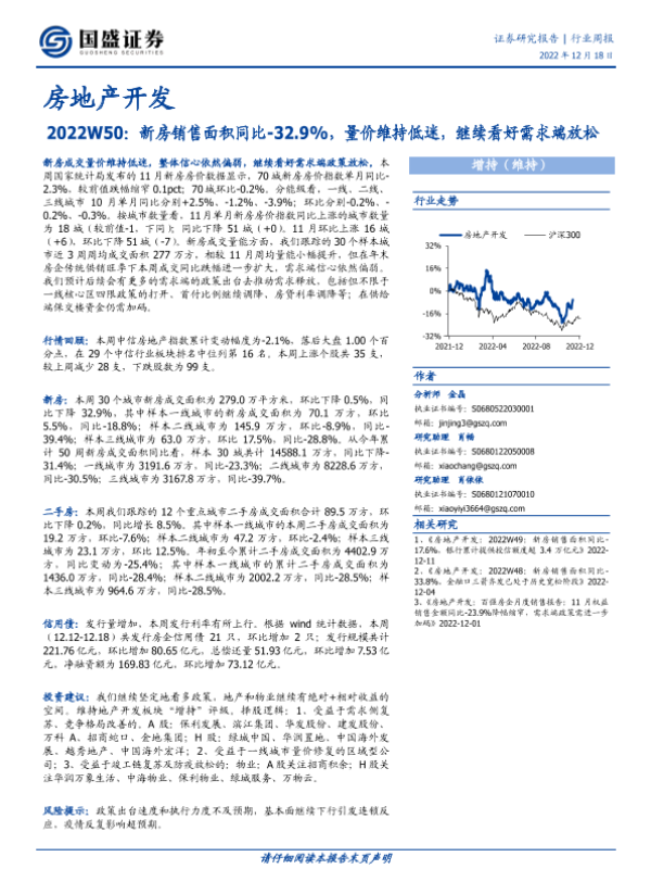 【国盛证券】【20221218】2022W50:新房销售面积同比-32.9%,量价维持低迷,继续看好需求端放松-14页 行业研究