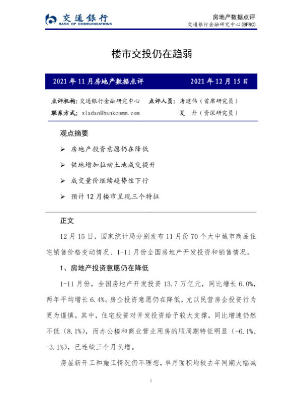 【交通银行金融研究中心】【20211215】2021年11月房地产数据点评:楼市交投仍在趋弱-5页 行业研究