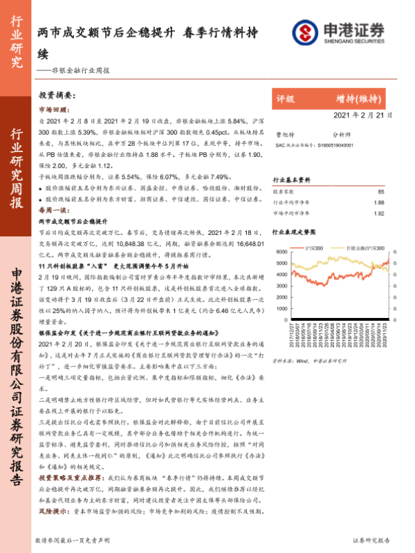 【申港证券】【20210221】非银金融行业周报:两市成交额节后企稳提升 春季行情料持续-12页 行业研究
