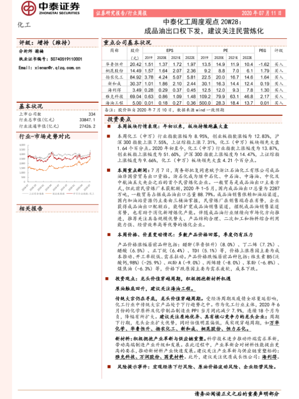 【中泰证券】【20200711】中泰化工周度观点20W28:成品油出口权下发,建议关注民营炼化-26页 行业研究