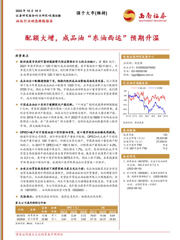 【西南证券】【20221010】油运行业动态跟踪报告:配额大增,成品油“东油西运”预期升温-15页 行业研究