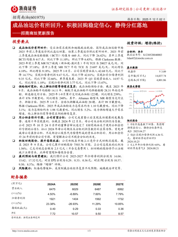 【浙商证券】【202512】成品油运价有所回升,积极回购稳定信心,静待分红落地——招商南油更新报告-3页 证券期货研究报告