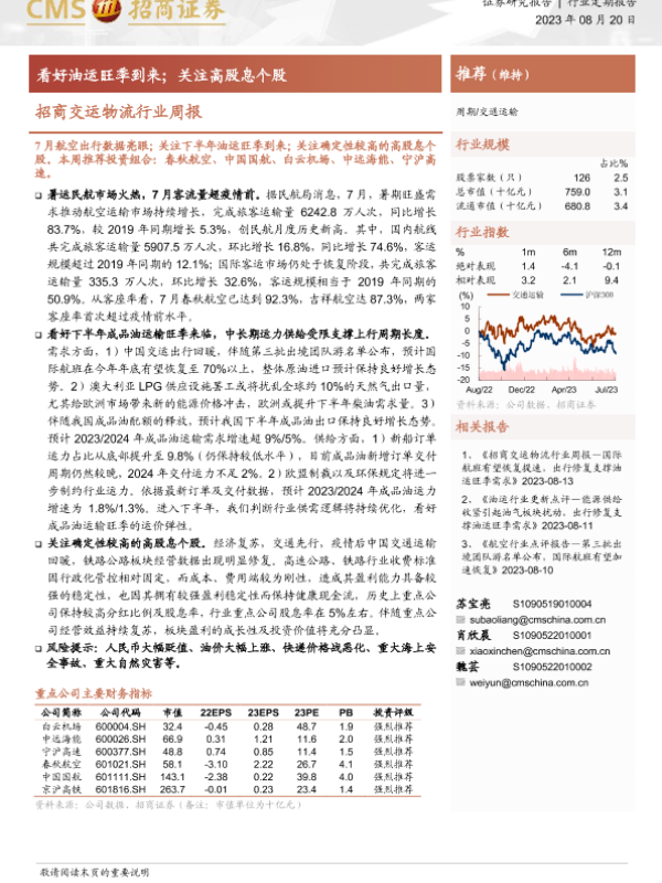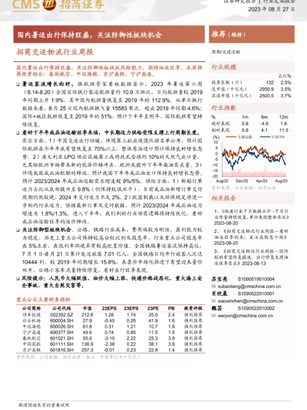 【海通证券】【20230827】交运物流行业周报:国内暑运出行保持旺盛,关注防御性板块机会-18页 行业研究