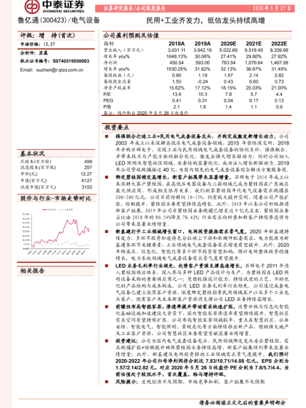【中泰证券】【20200527】民用+工业齐发力,低估龙头持续高增-21页 行业研究