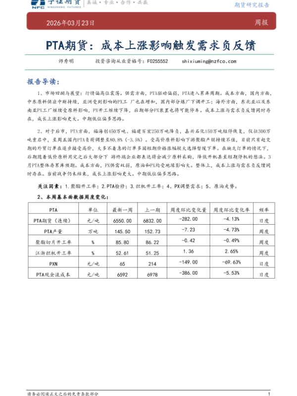【宁证期货有限公司】【202603】PTA期货:成本上涨影响触发需求负反馈-7页 证券期货研究报告