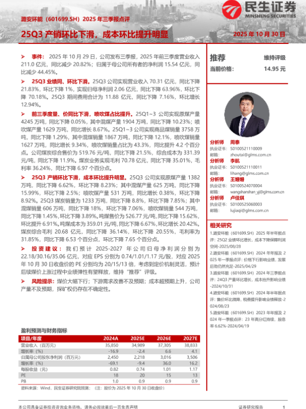 【民生证券】【202510】2025年三季报点评:25Q3产销环比下滑,成本环比提升明显-3页 证券期货研究报告