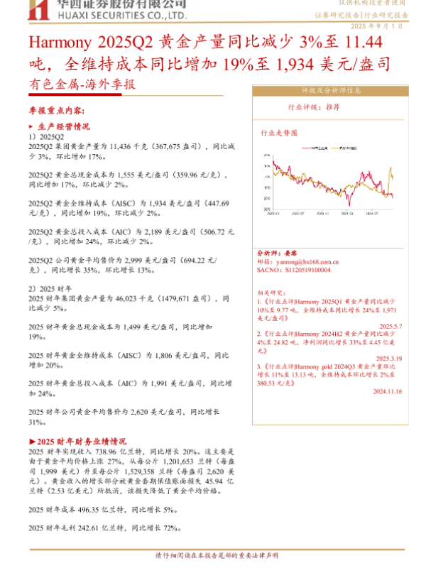【华西证券】【20250901】Harmony-2025Q2黄金产量同比减少3%至11.44吨,全维持成本同比增加19%至1,934美元/盎司-5页 证券期货研究报告