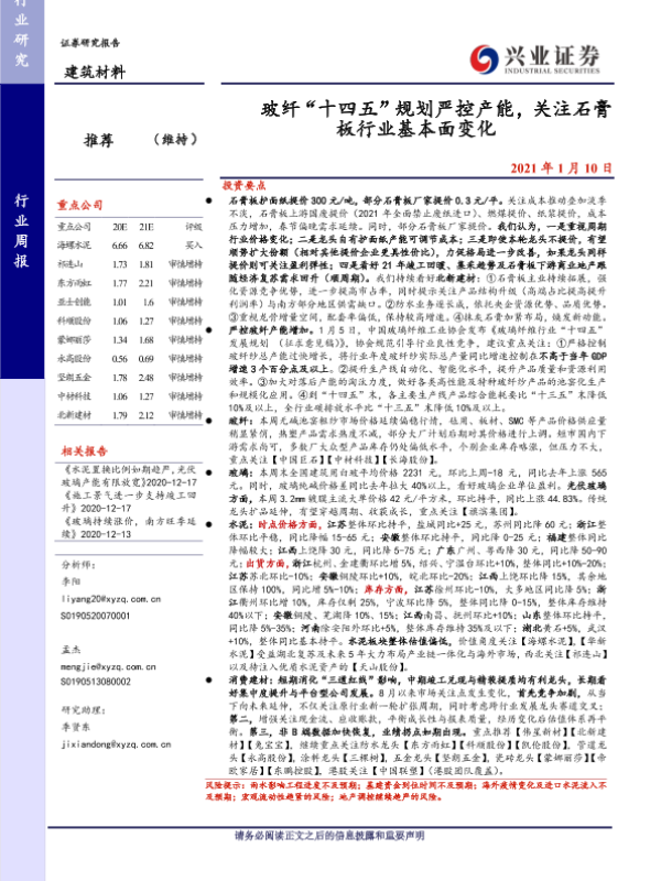 【兴业证券】【20210110】玻纤“十四五”规划严控产能,关注石膏板行业基本面变化-19页 行业研究
